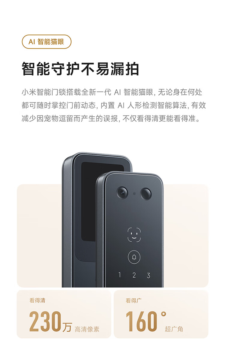 小米智能门锁 2 Pro 搭载 AI 智能猫眼,内置 AI 人形检测智能算法,减少因宠物逗留而产生的误报;支持微光全彩夜视,在微弱光线下可保持全彩画面;支持多设备跨屏联动,多屏查看门前画面,可利用手机远程可视对讲。