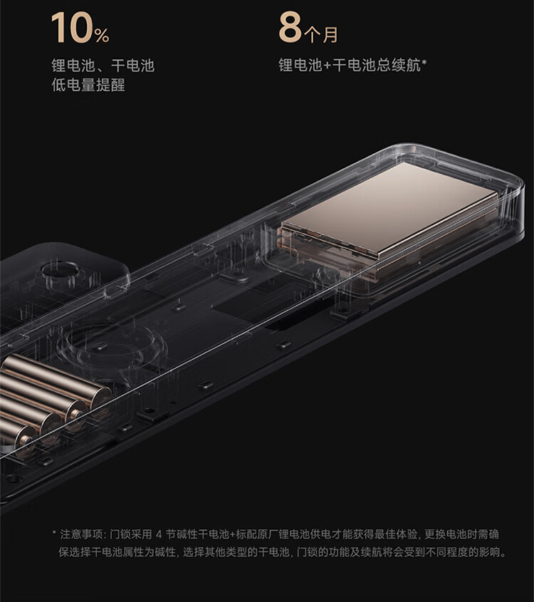 门锁智能供电系统由锂电池与干电池双重供电系统组成,当锂电池电量充足时,仅消耗锂电池电量,当锂电池电量低于 10% 时,自动进入超级省电模式,当锂电池电量耗尽时自动启用干电池供电。当电量全部耗尽,可用 Type-C 数据线外接充电宝为门锁应急供电完成临时开锁。