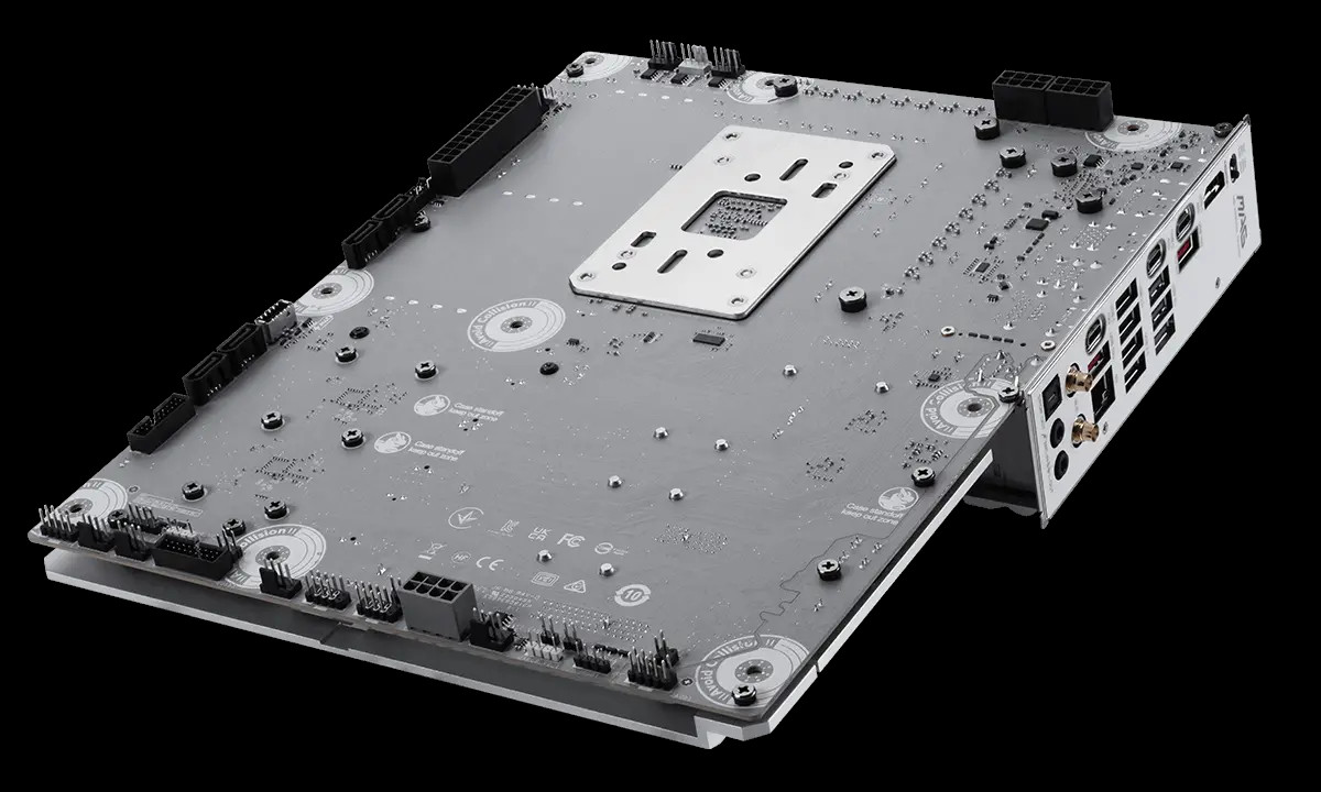 MAG X870E TOMAHAWK MAX WIFI PZ 基于 8 层 2oz 铜服务器级 PCB,配备 14+2+1 相供电(核心供电采用 80A SPS DrMOS),拥有 2 组 EPS 8-Pin CPU 供电接口。其支持 PCIe 插槽按键快拆,供电部分配备 7W/m·K 导热垫,包含集中式 EZ Debug LED 调试灯。