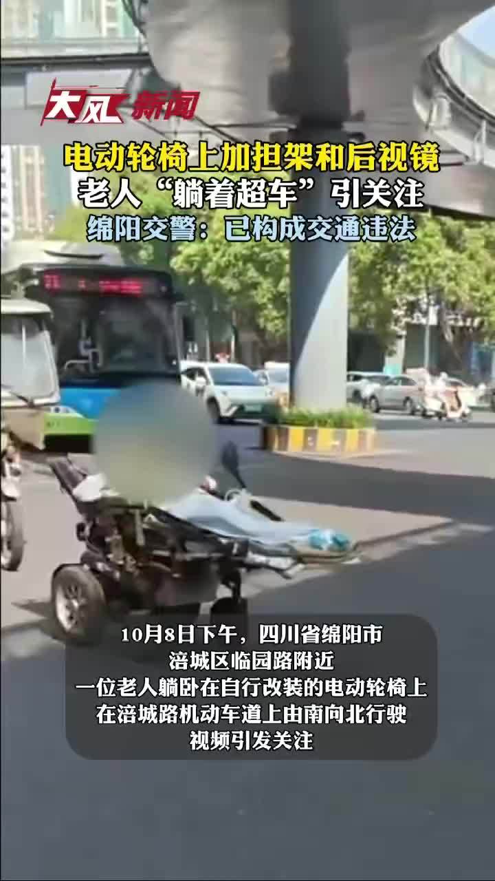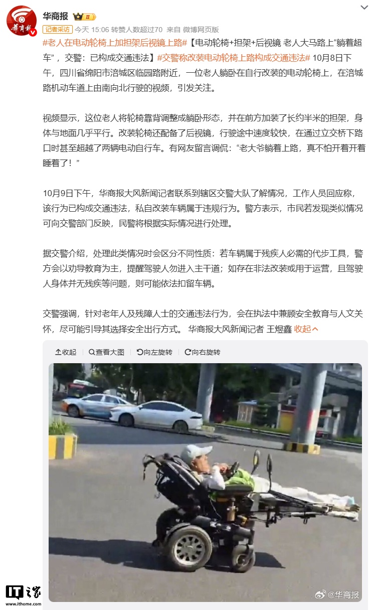 IT之家 10 月 10 日消息,据华商报大风新闻今天报道,10 月 8 日下午,四川省绵阳市涪城区临园路附近,一位老人躺卧在自行改装的电动轮椅上,在涪城路机动车道上由南向北行驶。