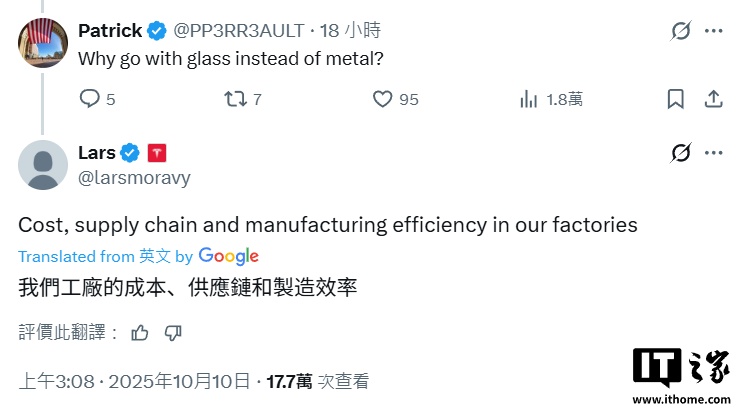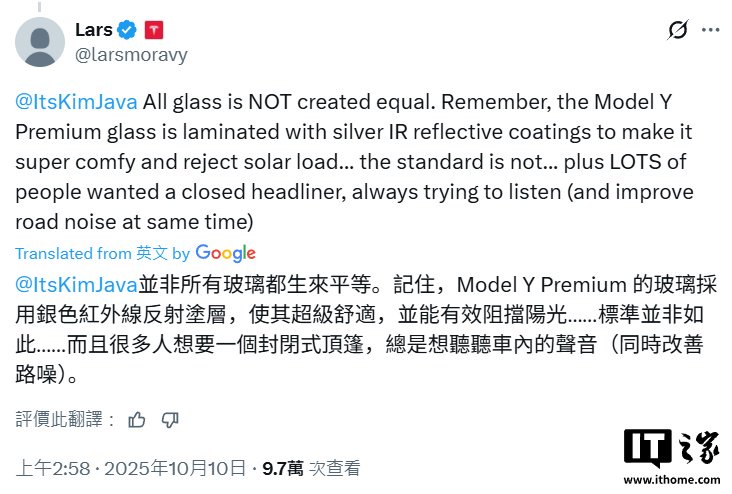 IT之家 10 月 10 日消息,特斯拉车辆工程副总裁 Lars Morav 今天在 X 平台发文,解答了大众关于 Model Y 标准版车顶配置的疑惑。