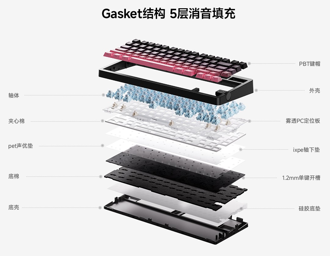 G75 V2 采用 75% 配列,方向键右侧包含竖向多媒体滚轮和指示电池电量的 RGB 呼吸灯。其支持全键热插拔,采用 Gasket 垫片固定,内置 PC 定位板和 5 层消音填充,侧面提供了三模切换开关和隐藏式 2.4GHz 接收器防尘收纳仓。