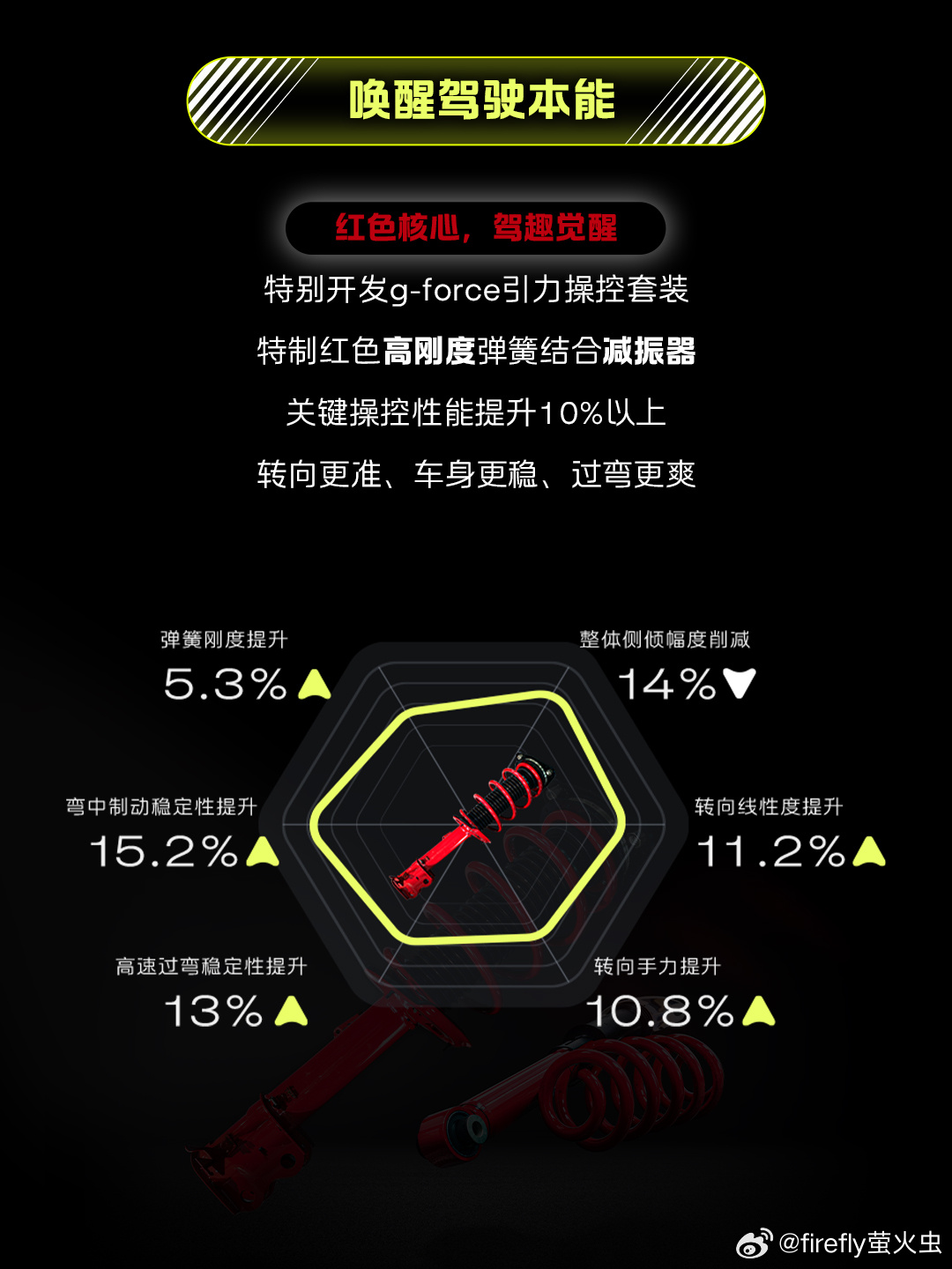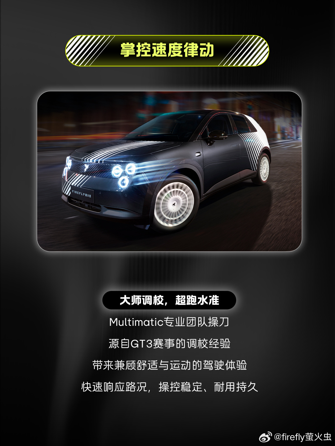 其他方面,firefly 萤火虫采用了前麦弗逊、后五连杆悬架,接近 50:50 前后车重比例,拥有 4.7 米同级最小转弯半径。