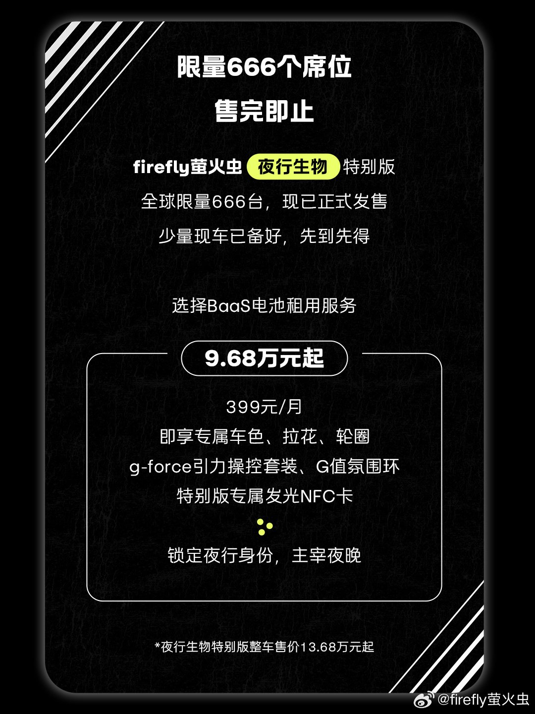 IT之家 10 月 11 日消息,蔚来旗下 firefly 萤火虫今晚宣布推出「夜行生物」特别版车型,全球限量 666 台,选择 BaaS 电池租用服务为 9.68 万元起,整车购买 13.68 万元起,提供少量现车。