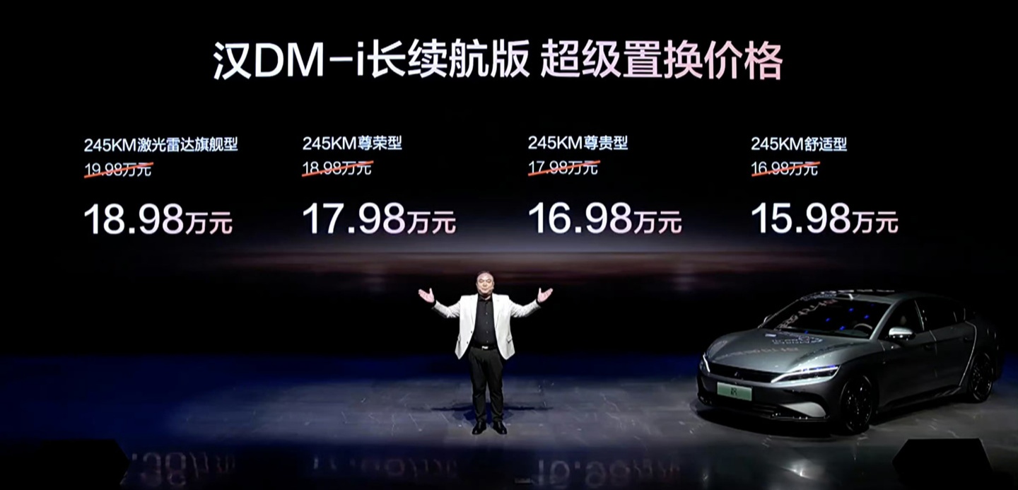IT之家 10 月 11 日消息,比亚迪今晚宣布推出 245 公里长续航版的汉智驾版领航加推车型,双版本都是 15.98 万元起。新车提供多种配置与价格选项,IT之家汇总如下: