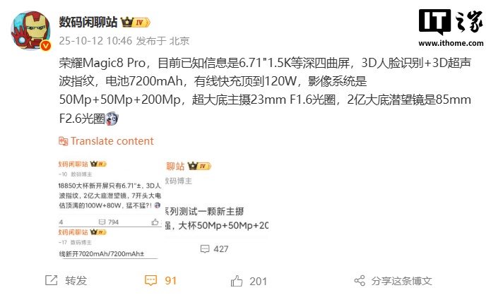IT之家 10 月 12 日消息,数码博主 @数码闲聊站 今日在微博曝光了荣耀 Magic8 Pro 的详细配置信息,荣耀 Magic8 系列暨 Magic OS 10 发布会将于 10 月 15 日举办。
