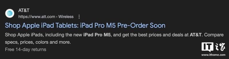 相关页面仅出现在 Google 搜索结果中,而 AT&T 商店内并未上架“M5 款 iPad Pro”,大概率只是标题占位符,但毫无疑问苹果正准备发布搭载 M5 芯片的新款 iPad Pro。