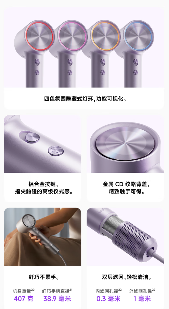 外观方面,新品提供四色氛围隐藏式灯环,铝合金按键、金属 CD 纹路背盖,机身重量 407 克,纤巧手柄直径 38.9 毫米,内滤网孔径 0.3 毫米,外滤网孔径 1 毫米。