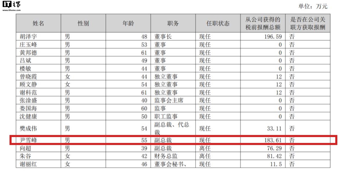 IT之家参考众泰汽车财报获悉,尹雪峰,1969 年 11 月出生,曾任哈飞汽车股份有限公司汽车研发中心主任,中国长安汽车集团哈飞汽车股份有限公司董事、副总裁、总工程师,哈尔滨博通汽车部件制造有限公司董事长,众泰汽车股份有限公司董事长助理,湖南江南汽车制造有限公司临沂分公司总经理,领途汽车有限公司常务副总裁等职务。2024 年,尹雪峰从众泰汽车获取的税前年薪为 183.61 万元。