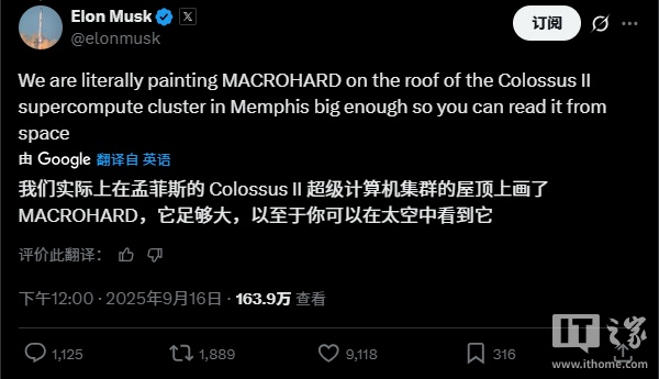此前,他回应网友称,“我们确实正在孟菲斯的巨像 II 超级计算集群的屋顶上喷涂 MACROHARD,字体大到你可以从太空中看到它。”