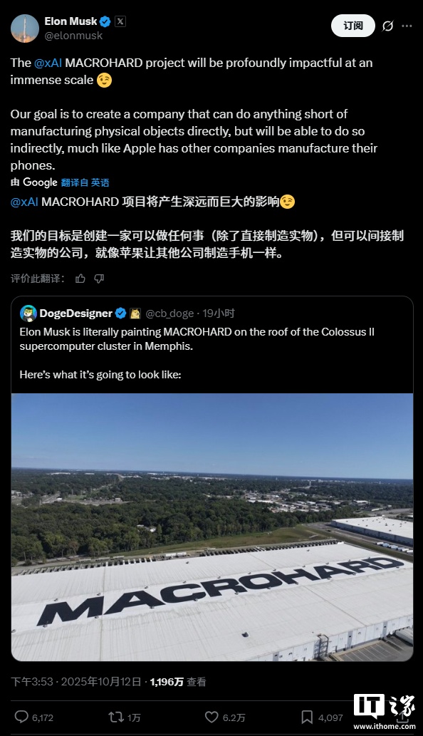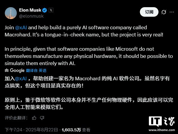 IT之家 10 月 13 日消息,埃隆・马斯克昨日在回应网友时称,“xAI 的 MACROHARD 项目将在巨大规模上产生深远影响。我们的目标是创建一家能够做任何事情的公司,除了直接制造物理物体,不过它将能够间接做到这一点,就像苹果让其他公司制造他们的手机一样。”