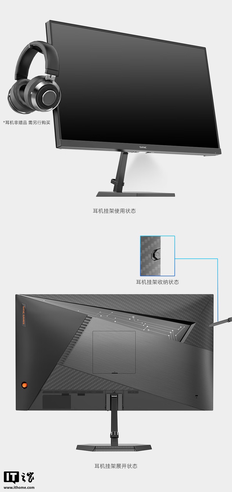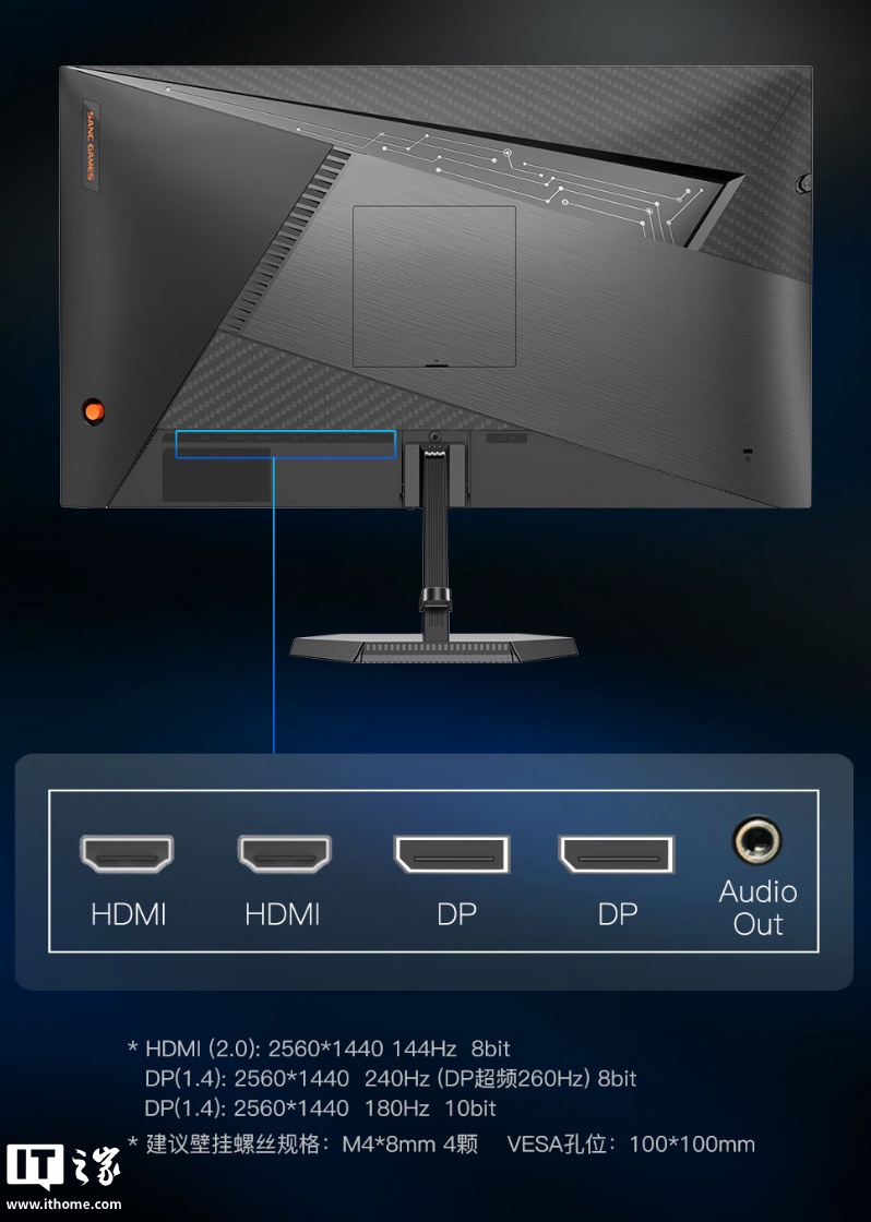 这款显示器支架支持升降 / 倾斜 / 旋转,显示器本体支持 VESA 100x100mm 壁挂,侧面提供耳机挂架,底部配备小夜灯,背部提供 2 个 HDMI 2.0(2K 144Hz 8-Bit)、1 个 DP 1.4(2K 260Hz 8-Bit)、1 个 DP 1.4(2K 180Hz 10-Bit)、1 个 3.5mm 音频接口。