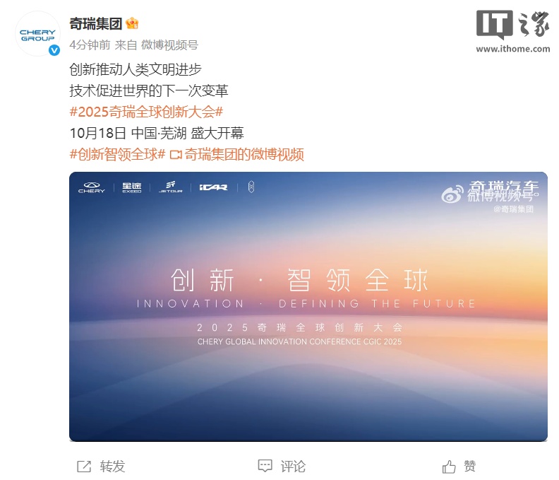 IT之家 10 月 13 日消息,奇瑞集团今日官宣,2025 奇瑞全球创新大会将于 10 月 18 日在安徽芜湖开幕。
