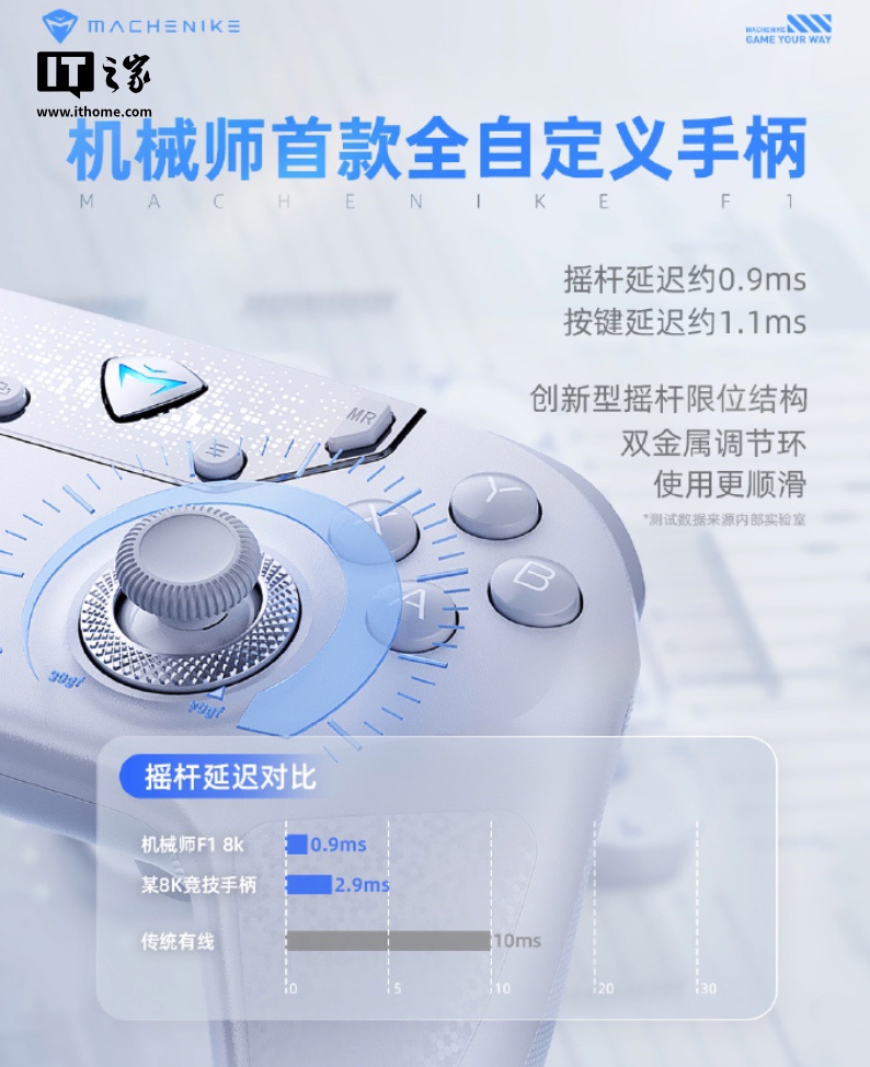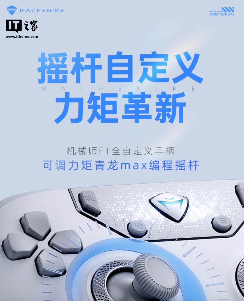 IT之家 10 月 13 日消息,机械师现已预热一款“行业首款全自定义手柄”机械师 F1,其主打“按键自定义、双模真 8KHz 回报率”,将于近期上市。