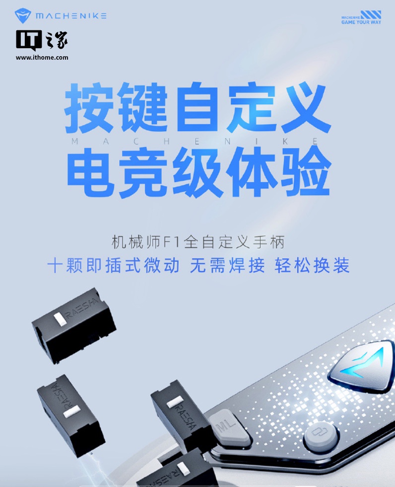 IT之家参考官方预热获悉,这款手柄使用对称式布局,匹配 10 颗即插式微动,号称不用电烙铁,免工具徒手拔插,三脚微动随心换。同时还开放键程、死区、全接口,支持用户完全自行定制。
