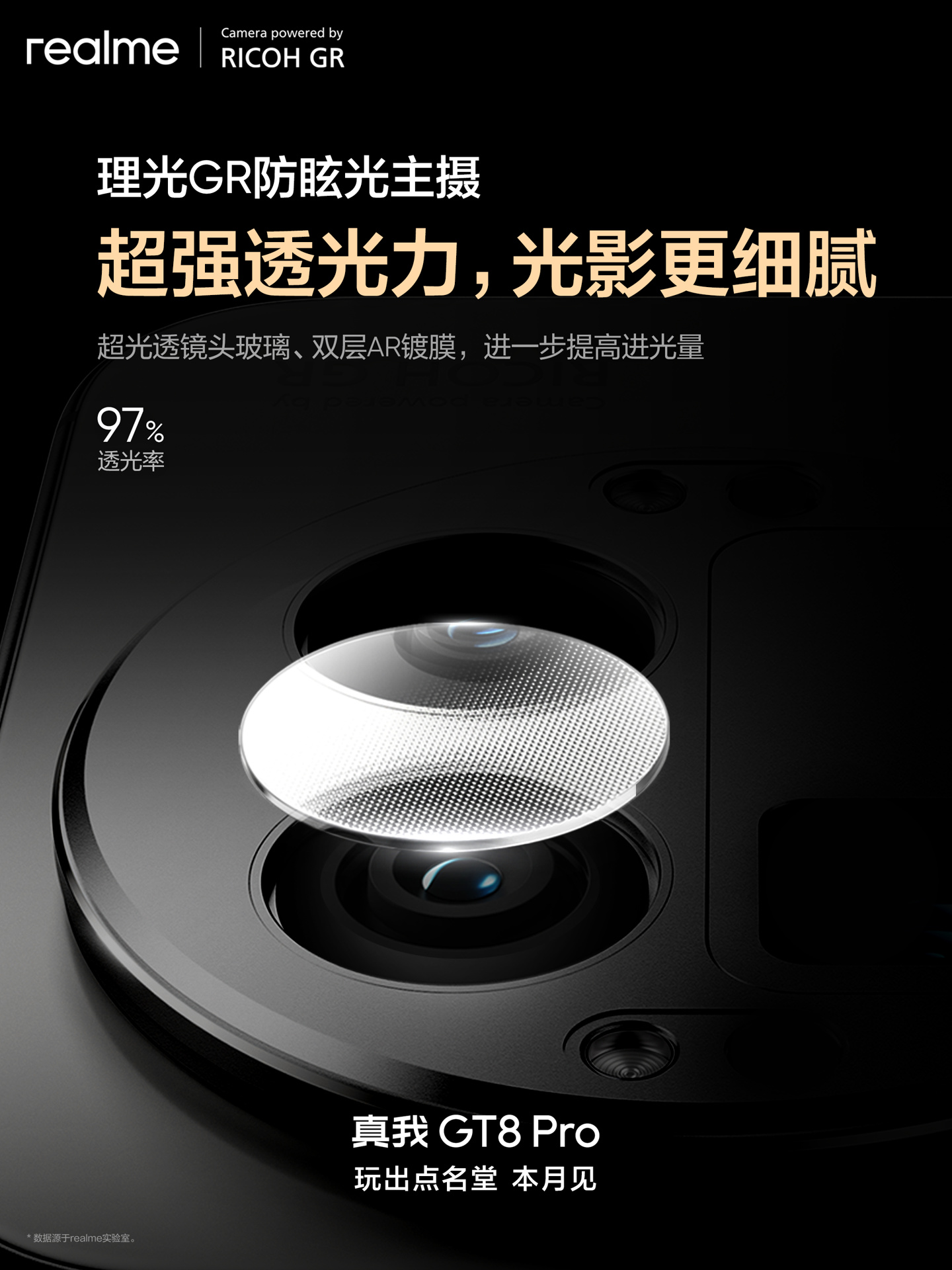 防眩光、低畸变:为了消除眩光、控制反射,GT8 Pro 采用了全新的镜片结构,重新设计了整个主摄模组。7P 高透镜片、5 层超低反镀膜,每一层都能精准地捕捉并消除大量反射,从而抑制鬼影和眩光,让画面看起来更加干净、通透、有立体感,告别“灰蒙蒙”的感觉,并使镜头的反射率控制到低至 0.2%。