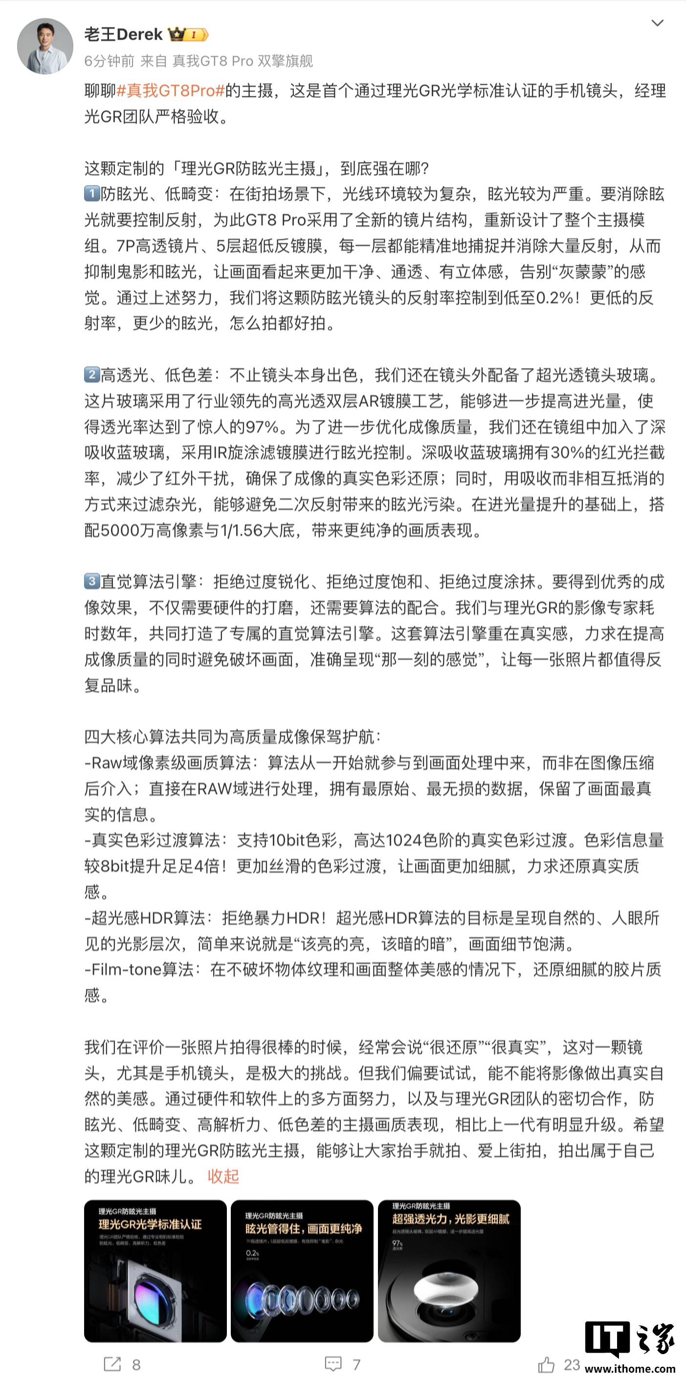 IT之家 10 月 13 日消息,真我副总裁王伟 @老王 Derek 今天下午通过微博,详细介绍了真我 GT8Pro 手机搭载的主摄。他表示,该镜头是首个通过理光 GR 光学标准认证的手机镜头,并且经理光 GR 团队严格验收。
