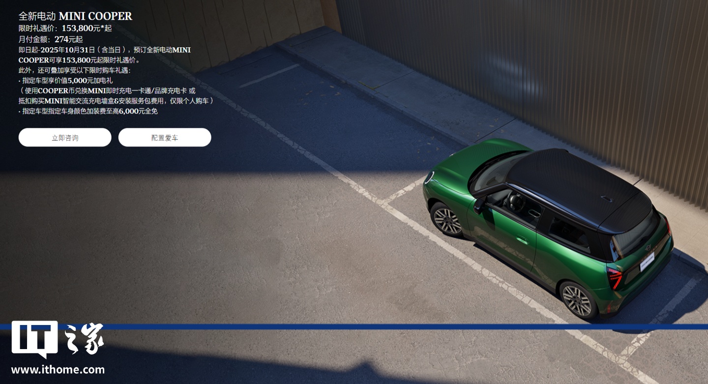 IT之家 10 月 13 日消息,2025 款电动 MINI COOPER 已上市,此次共推出 2 款车型,指导价分别为 20.98 万元和 23.98 万元。即日起至 2025 年 10 月 31 日,消费者可享受限时优惠,限时礼遇价 15.38 万元起。该车定位为纯电动小型车,最高 CLTC 纯电续航里程 466 公里。