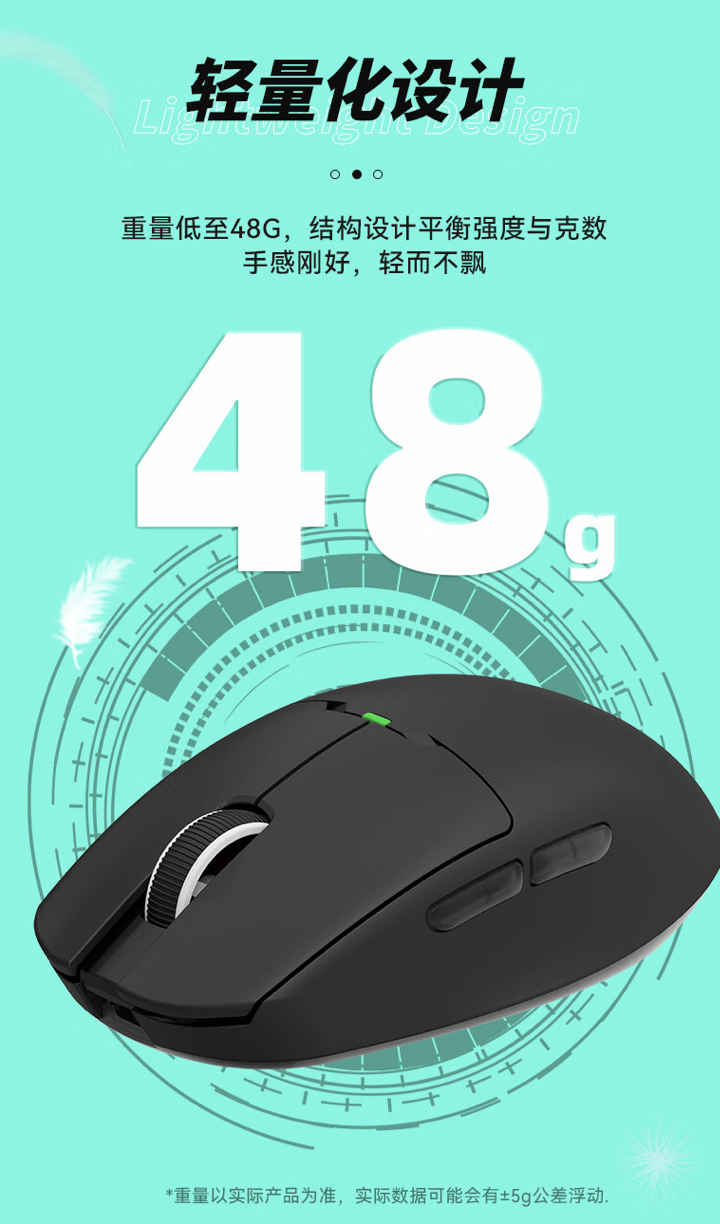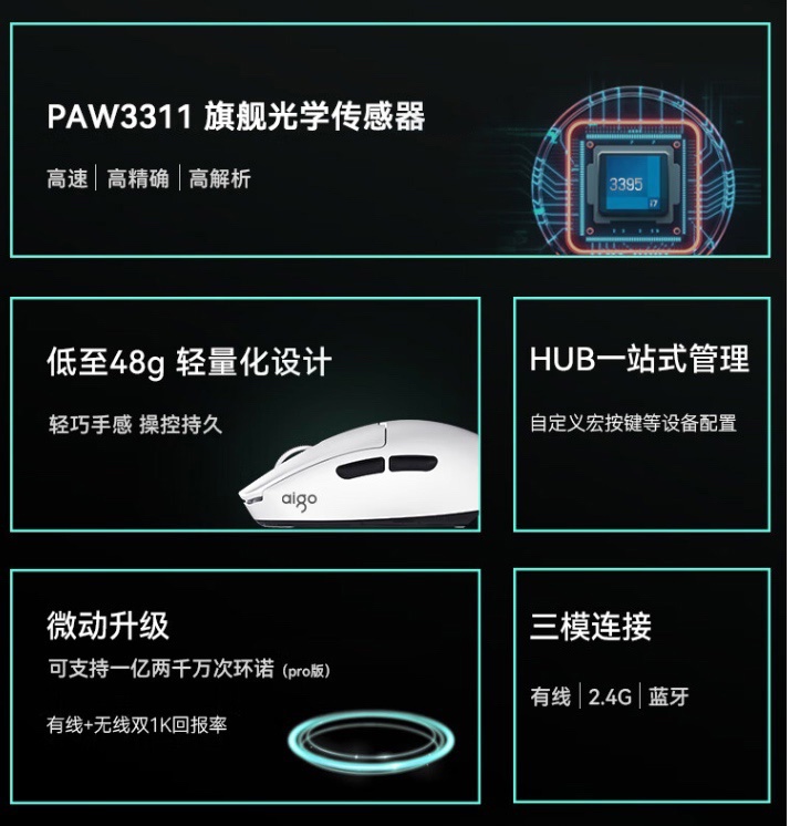 据介绍,该鼠标整体重量约 48 克,配有亲肤外壳,拥有 300 毫安时电池,采用 PAW3311 传感器,至高支持 12000 DPI,配备 5000 万次寿命环诺蓝壳粉点微动开关,支持 1KHz 回报率。