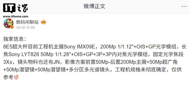 影像方面,该博主此前曾曝光其工程机搭载索尼 IMX09E 图像传感器,200Mp 1/1.12"+OIS+GP 光学模组,长焦 Sony LYT828 50Mp 1/1.28"+OIS+GP+3P+3P 内对焦光学模组,固定光学焦段 3X±,镜头物料也还有 JN。
