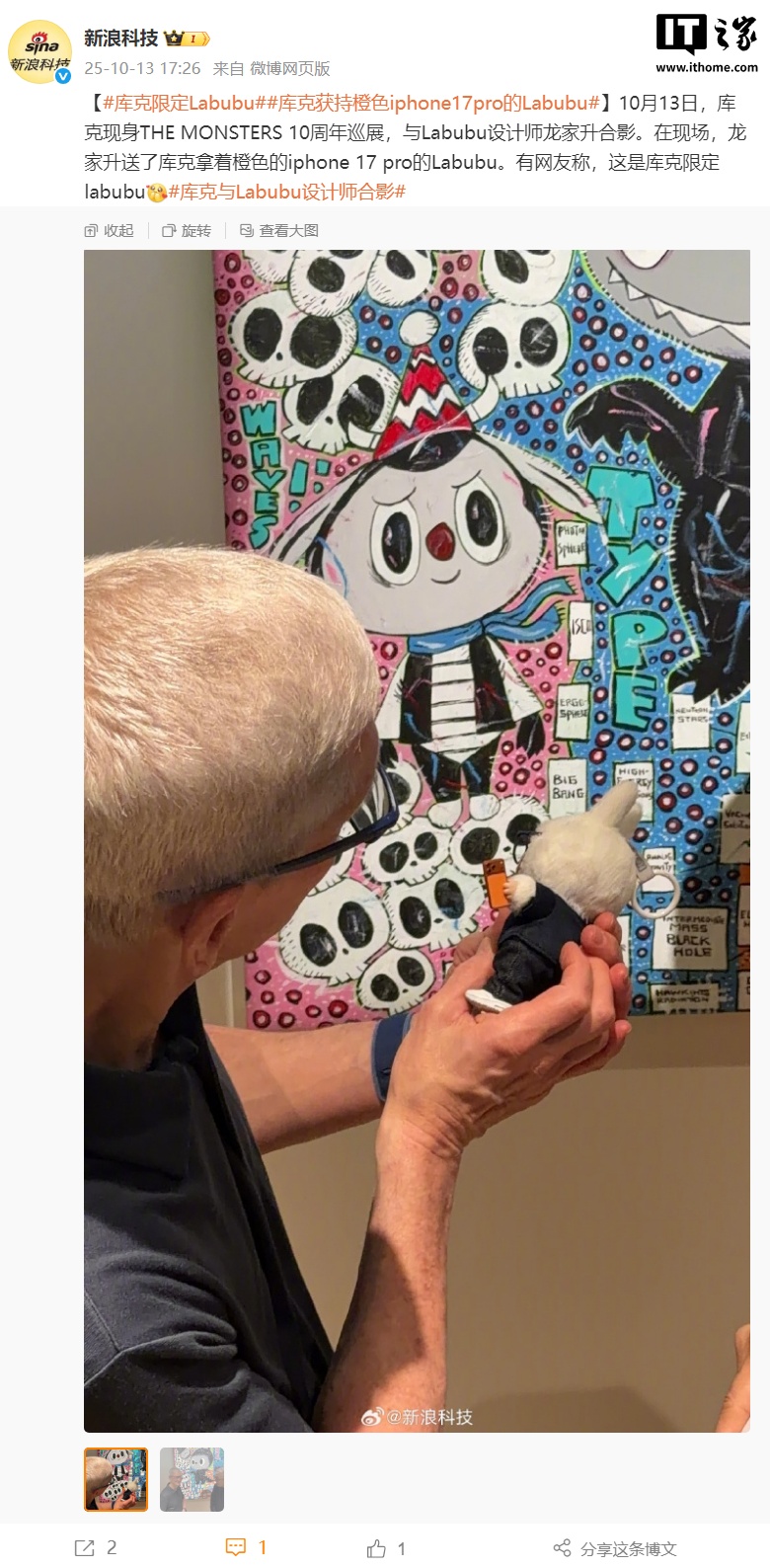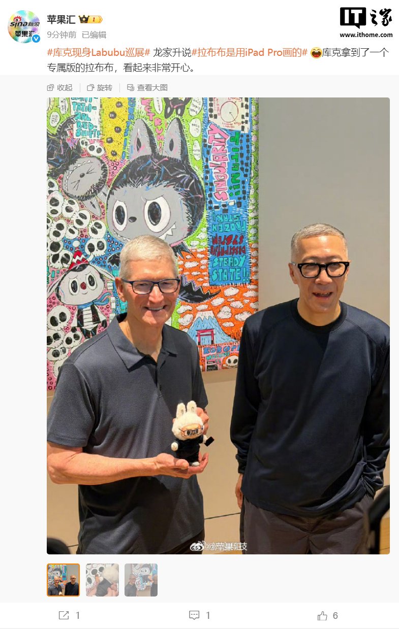 IT之家 10 月 13 日消息,据新浪科技苹果汇消息,苹果 CEO 库克今日现身 Labubu 的 THE MONSTERS 10 周年巡展,与 Labubu 设计师龙家升合影。
