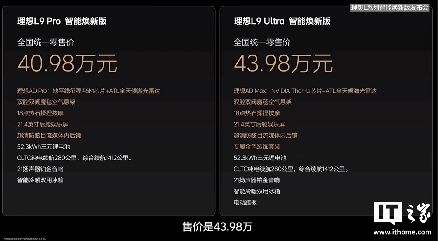 IT之家注意到,目前在售的理想 L9 智能焕新版于今年 5 月发布,Pro 售价 40.98 万元,Ultra 售价 43.98 万元。该车全系标配双腔双阀魔毯空悬,辅助驾驶硬件同样迎来升级,新增雅灰特别版车漆,Ultra 版的 logo、后视镜、窗框饰条换用具备磨砂质感的哑光金套件。该车车内配备 18 点热石按摩座椅,后排吸顶屏尺寸增加至 21.4 英寸,分辨率为 3K,亮度可达 800nit。