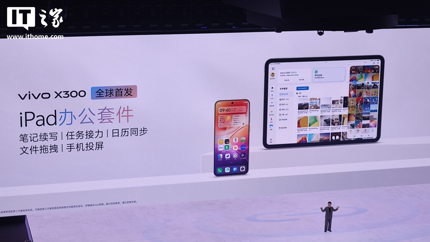 vivo X300 系列首发搭载 OriginOS6 系统,全球首发 iPad 办公套件,支持笔记续写、任务接力、日历同步、文件拖拽、手机投屏等功能;与 Apple Watch 生态破壁,支持电话、短信、通知流转,运动健康数据同步。