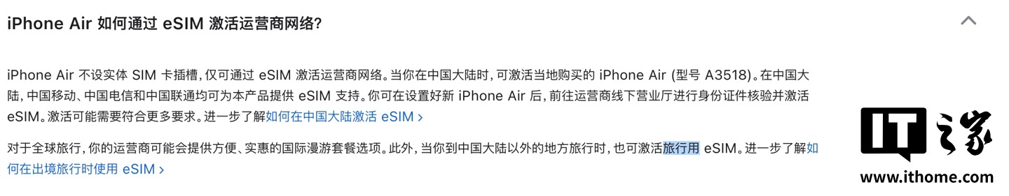IT之家提醒:暂不知悉国行 iPhone Air 是否长期可用海外 eSIM、是否在内地可用海外 eSIM 漫游,应等待首发测试。