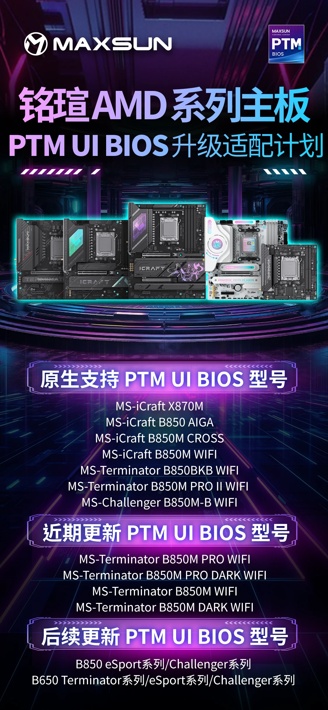 eSport 电竞与 Challenger 挑战者系列的 B850 主板,以及 Therminator、eSport 、Challenger 三大系列的 B650 主板。