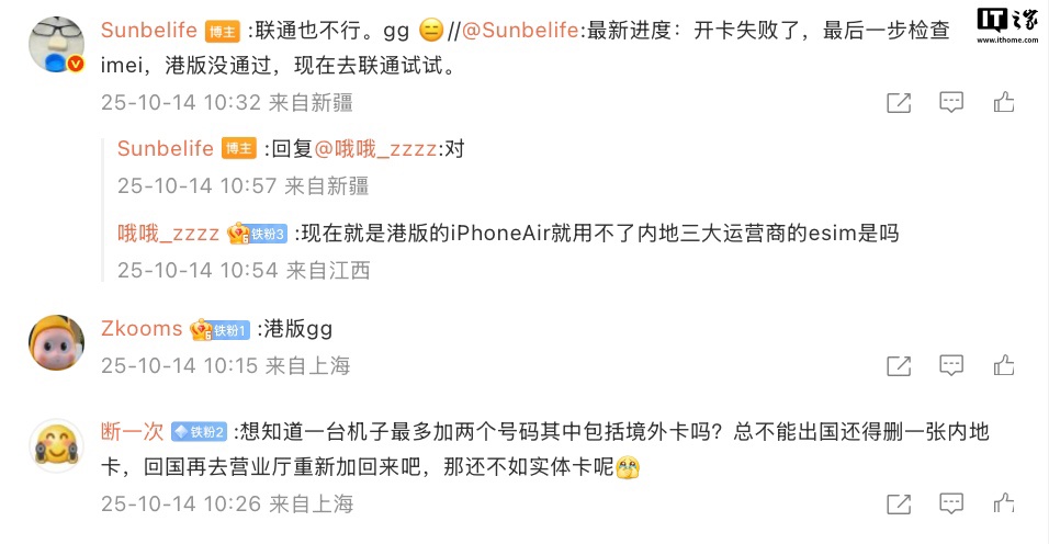 IT之家 10 月 14 日消息,博主 @Sunbelife 发文,透露经实际测试,港版苹果 iPhone Air 手机无法写入中国移动、中国联通 eSIM,在最后一步检查 IMEI 过程中校验失败。