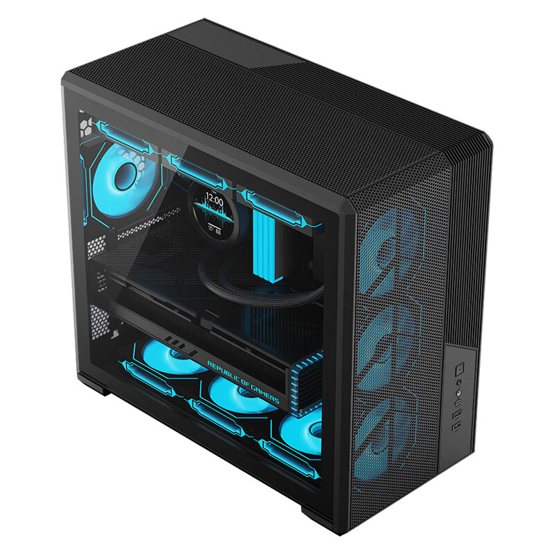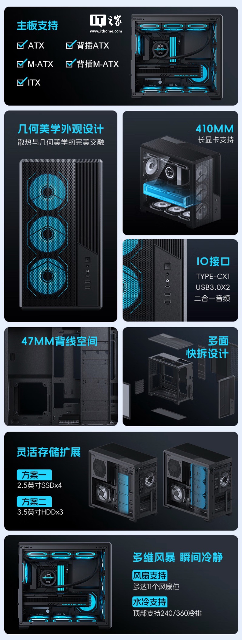 兼容性方面,系列机箱配备了 7 个 PCI 扩展槽,可安装四个 2.5 寸硬盘或三个 3.5 寸硬盘,支持长度≤180mm 的 ATX 电源,CPU 散热器限高 165mm;显卡限长 410mm(前面板不装风扇时),可安装至高 11 把 120mm 散热风扇。