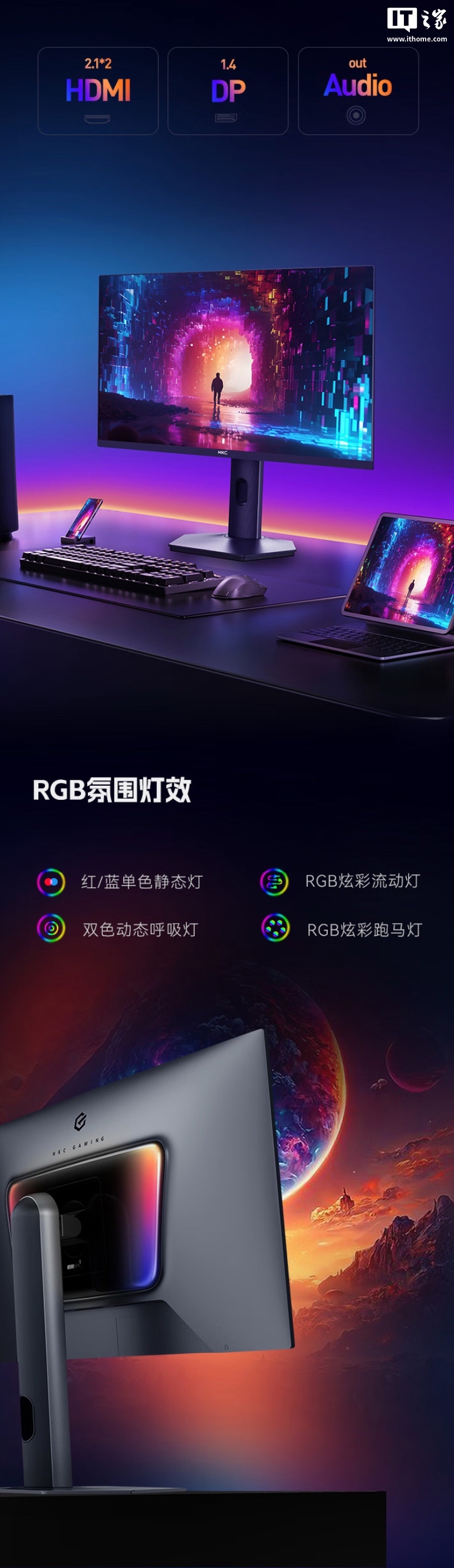 该机支架支持升降 / 倾斜 / 旋转,显示器本体带有 RGB 灯,同时支持 VESA 100x100mm 壁挂,提供 2 个 HDMI 2.1、1 个 DP 1.4、1 个 3.5mm 音频接口。