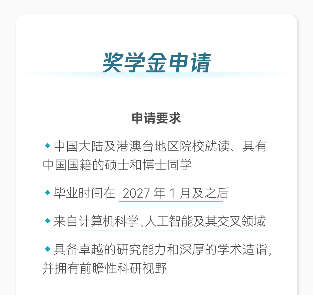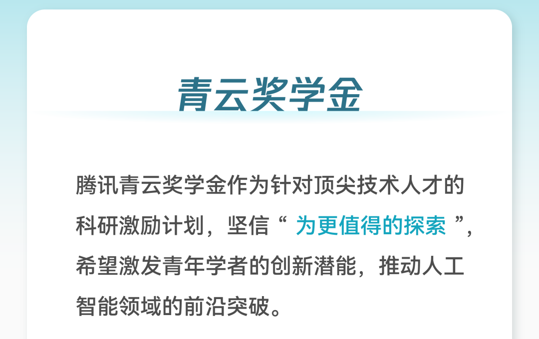 据IT之家了解,「青云奖学金」重点关注人工智能领域的基础研究与应用创新,针对中国大陆及港澳台地区院校就读、具有中国国籍的硕士或博士同学,希望申请者来自计算机科学、人工智能及其交叉领域,具备卓越的研究能力和深厚的学术造诣,并拥有前瞻性科研视野。