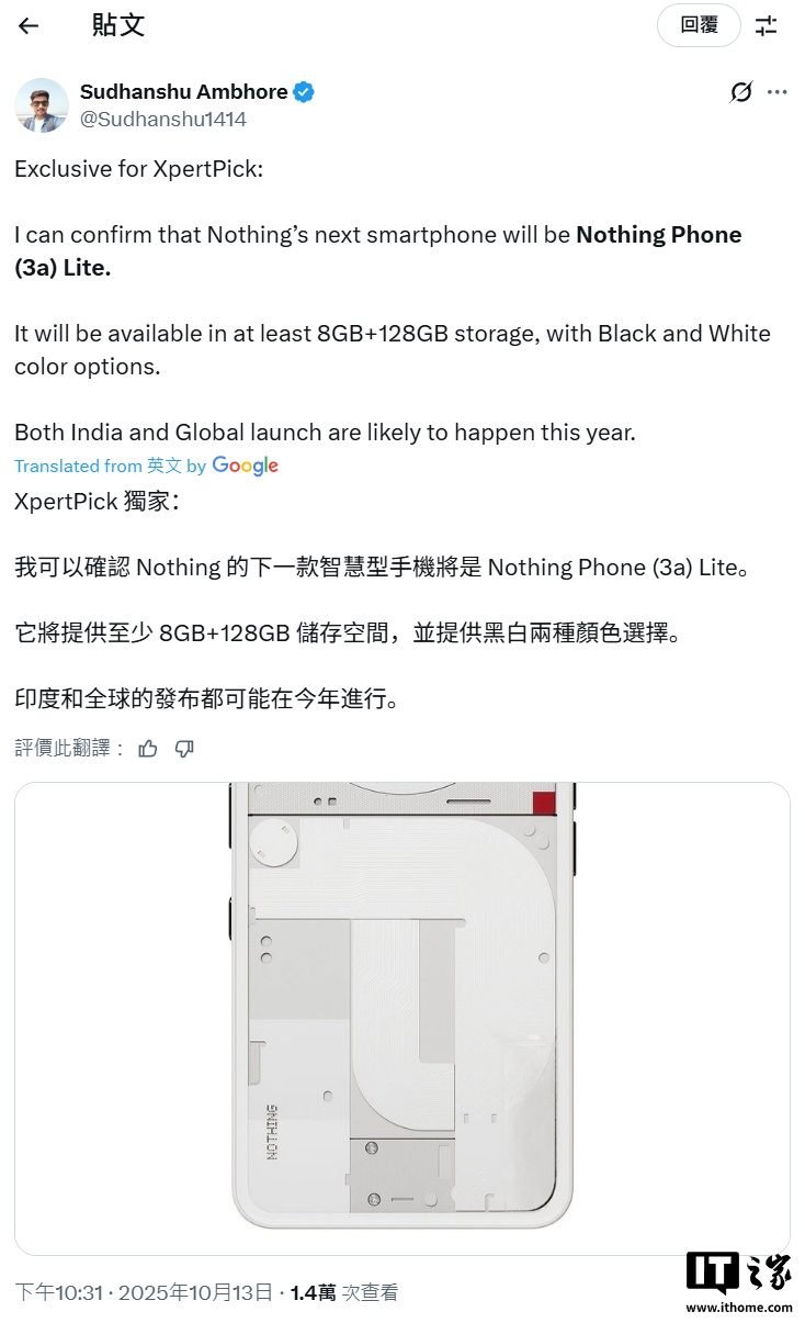 Sudhanshu 表示,这台手机的型号是 Nothing Phone (3a) Lite,预计可选黑色和白色配色,但可能针对特定地区市场推出更多配色,只有 8GB 内存 + 128GB 存储空间一种配置可选,将于今年内在全球市场上市,包括印度市场。