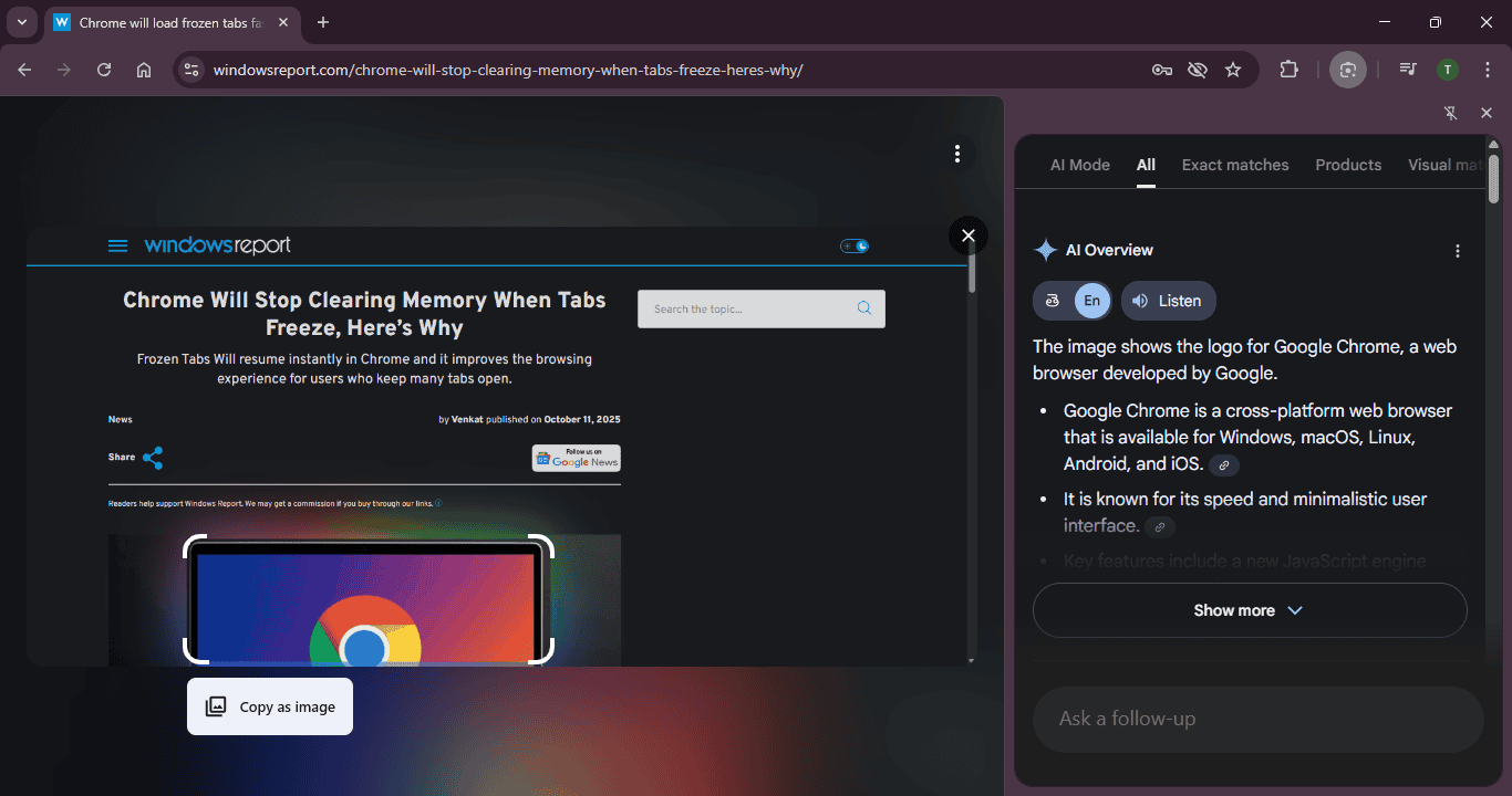 当用户使用 Google Lens 搜索图片或进行视觉 AI 识别时,侧边栏会自动弹出,可在下方的文本框中输入问题,按下回车键后就可以看到答案,无需打开新标签页就能进一步探索相关信息。