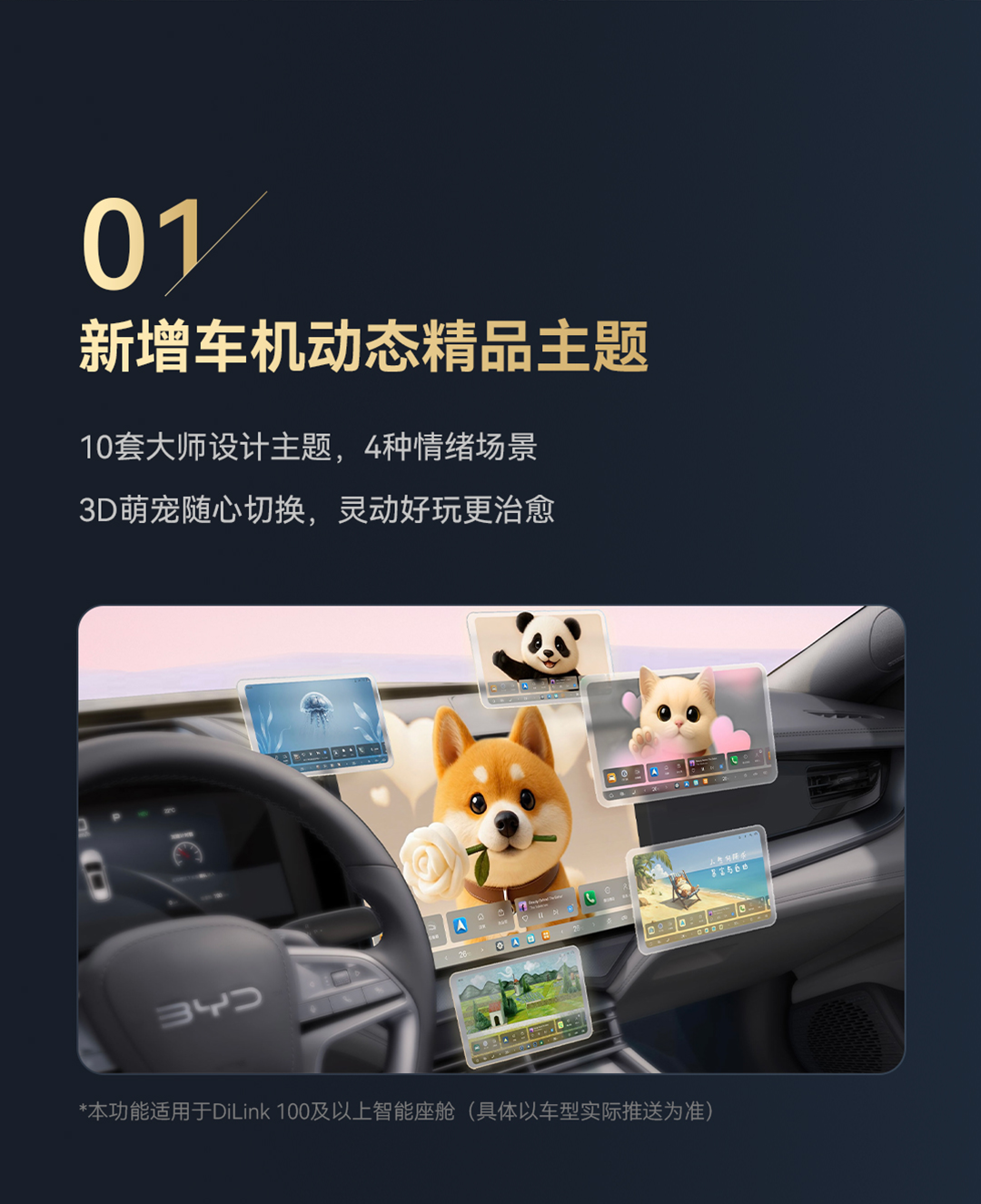 新增车机动态精品主题:10 套大师设计主题,4 种情绪场景(本功能适用于 DiLink 100 及以上智能座舱,具体以车型实际推送为准)