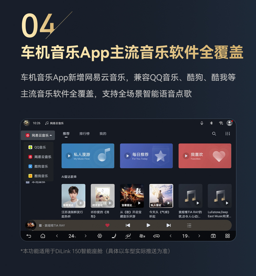 车机音乐 App 主流音乐软件全覆盖:车机音乐 App 新增网易云音乐,兼容 QQ 音乐、酷狗、酷我等,主流音乐软件全覆盖,支持全场景智能语音点歌(本功能适用于 DiLink 150 智能座舱,具体以车型实际推送为准)