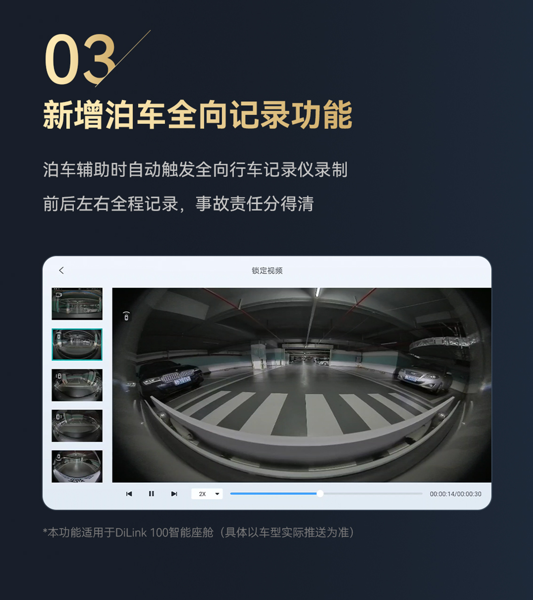 新增泊车全向记录功能:泊车辅助时自动触发全向行车记录仪录制,前后左右全程记录(本功能适用于 DiLink 100 及以上智能座舱,具体以车型实际推送为准)