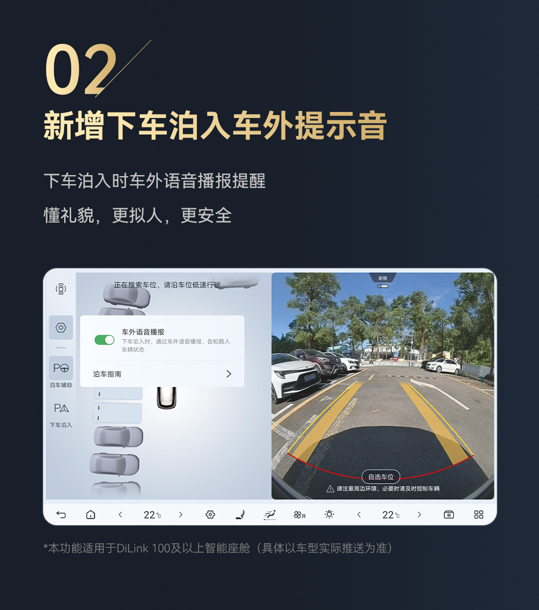 新增下车泊入车外提示音:下车泊入时车外语音播报提醒(本功能适用于 DiLink 100 及以上智能座舱,具体以车型实际推送为准)
