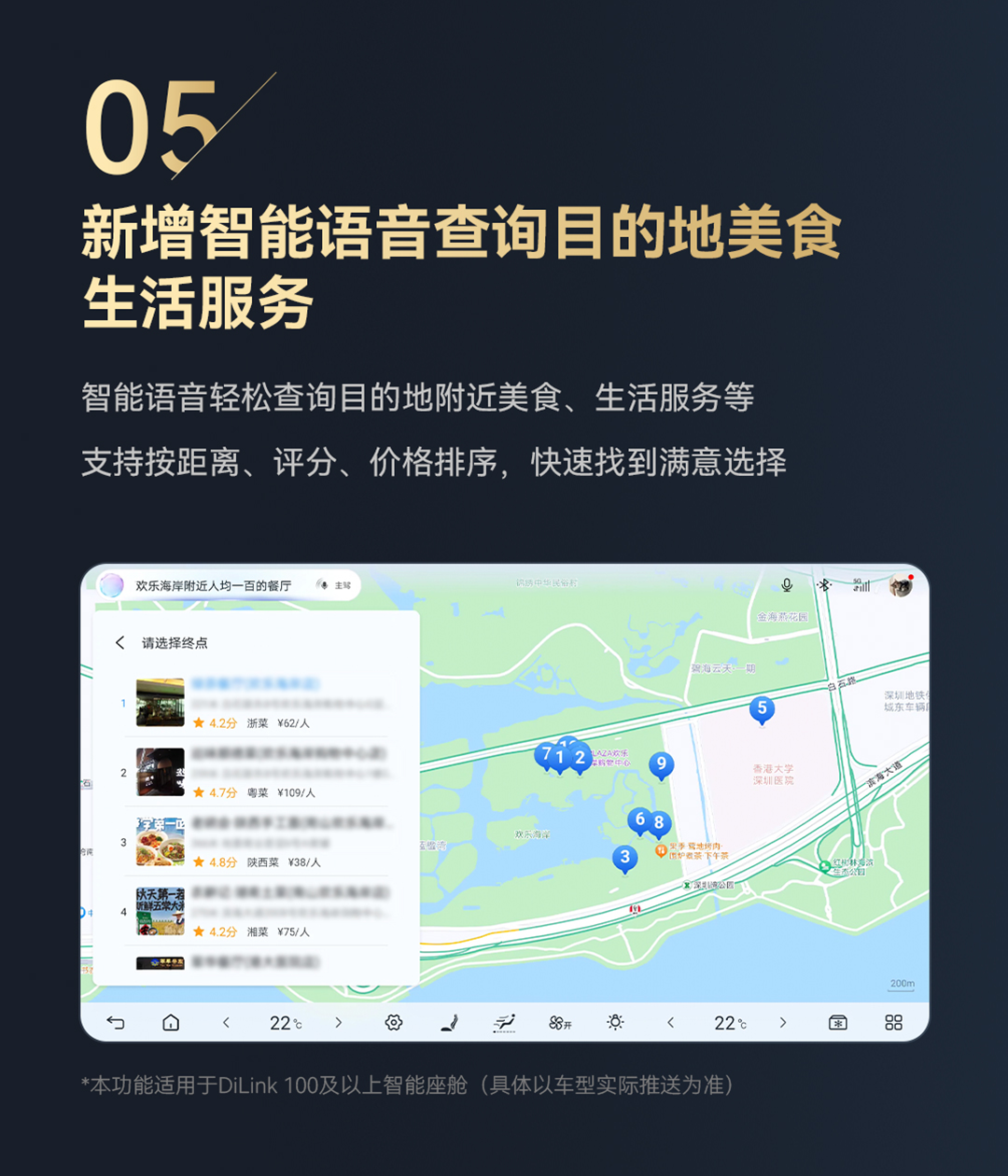 新增智能语音查询目的地美食生活服务:智能语音查询目的地附近美食、生活服务等,支持按距离、评分、价格排序(本功能适用于 DiLink 100 及以上智能座舱,具体以车型实际推送为准)