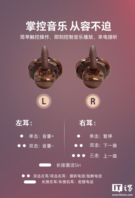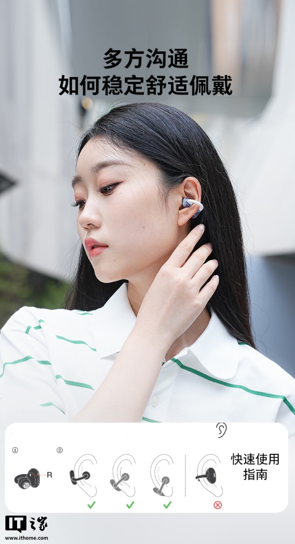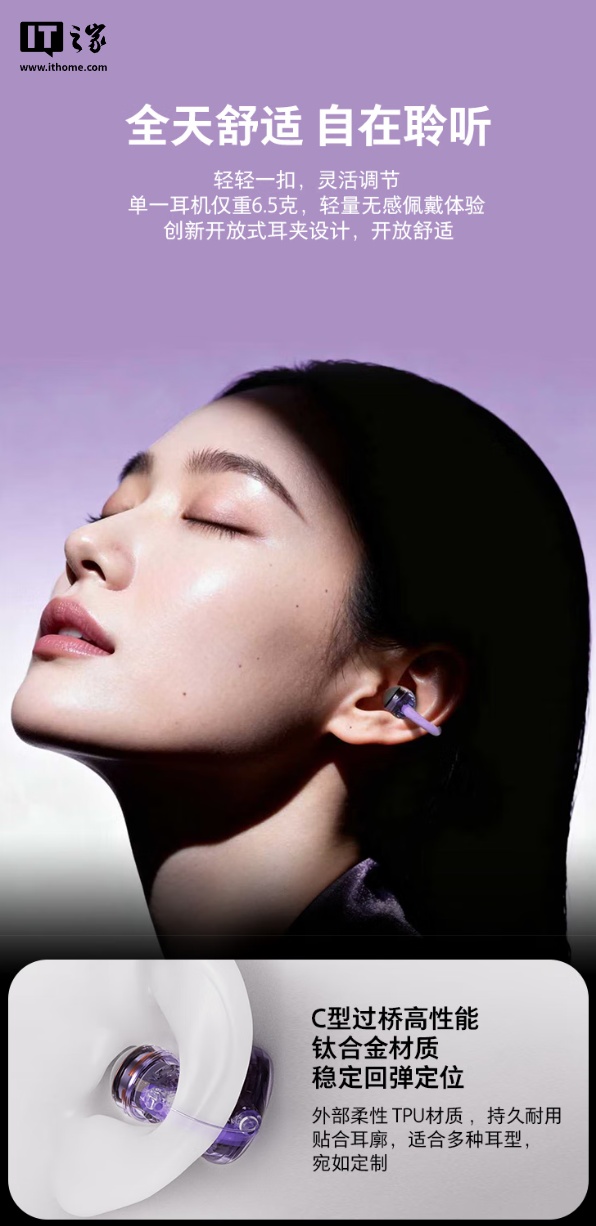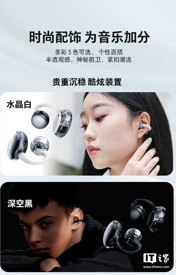 据介绍,这款耳机的充电盒、本体均采用半透明设计,核心处加固驱动单元,可增强音乐输出一致性和清晰度,可选水晶白、深空黑、藏青蓝、青黛紫、灵琥珀 5 种配色,耳机采用开放式结构设计,可在聆听音乐的同时保持对外接感知,适用于出行、办公等场景。