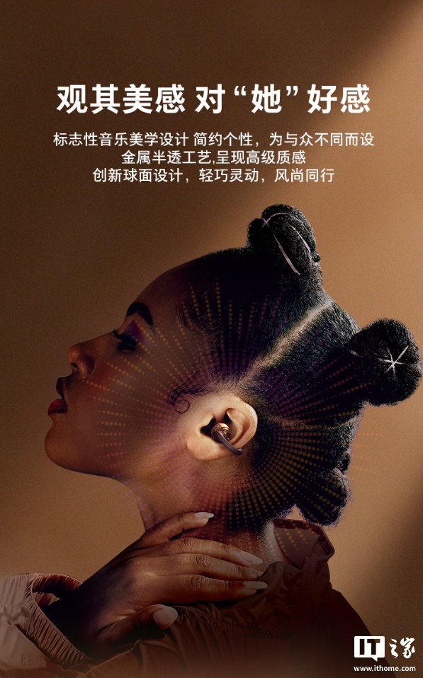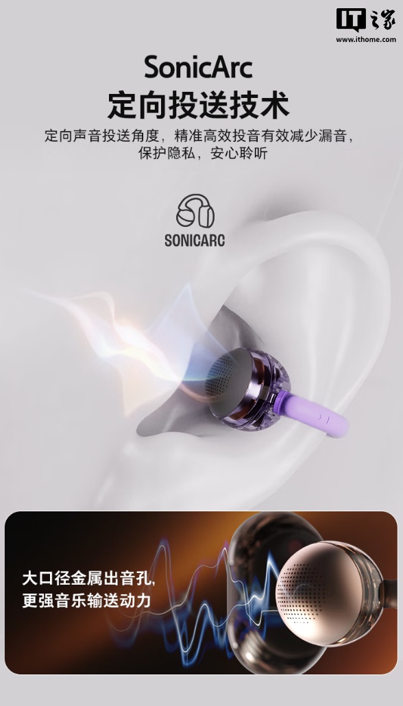 硬件方面,这款耳机搭载 11mm 高品质动圈单元,定制驱动单元加载镀钛双层振膜,搭配自适应低频增强算法,可呈现动感低频,还支持 SonicArc 定向投送技术,可减少漏音现象,保护用户隐私。