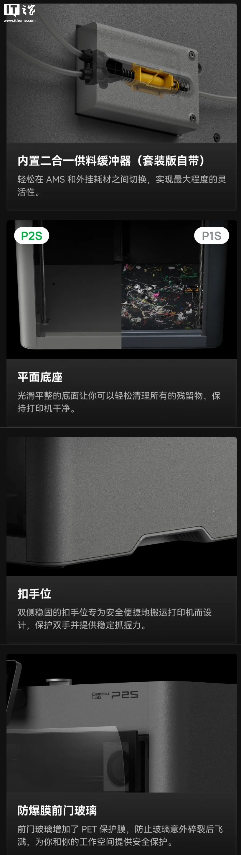 拓竹 P2S 还有多项细节提升,永磁同步伺服供料电机将送料速度提高 60%,内置二合一供料缓冲器,以及平面底座、搬运扣手位、防爆膜前门玻璃等。