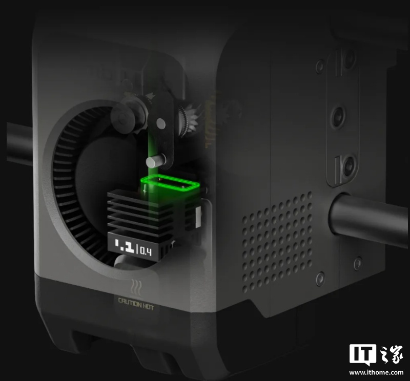 P2S 采用了快拆热端设计,无需拔插线缆,只需轻轻打开热端锁扣,即可磁吸装取整个热端组件,缩短了更换喷嘴的时间,并消除了接错线的风险;挤出机齿轮和喷嘴都采用硬化钢材质,提高耐磨性。