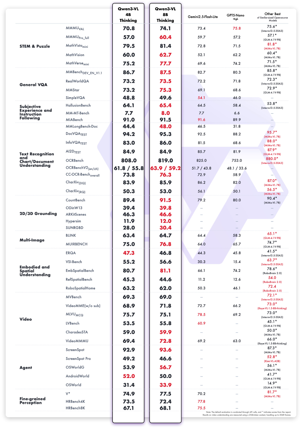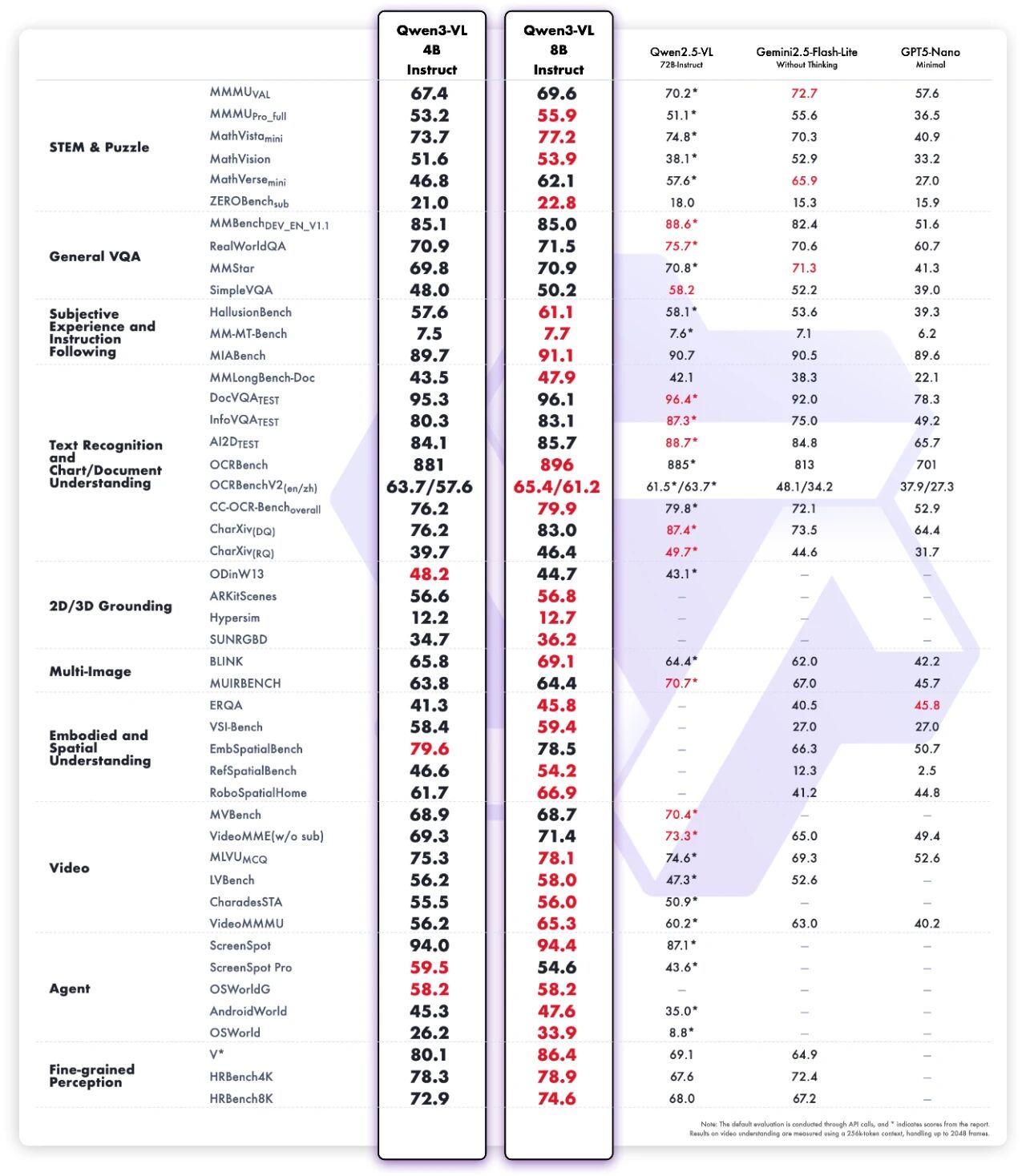 Qwen3-VL-8B 在 STEM、VQA、OCR、视频理解和 Agent 任务等公开评测上表现优异,不仅超越 Gemini 2.5 Flash Lite 和 GPT-5 Nano,甚至可以媲美上一代超大尺寸模型 Qwen2.5-VL-72B。