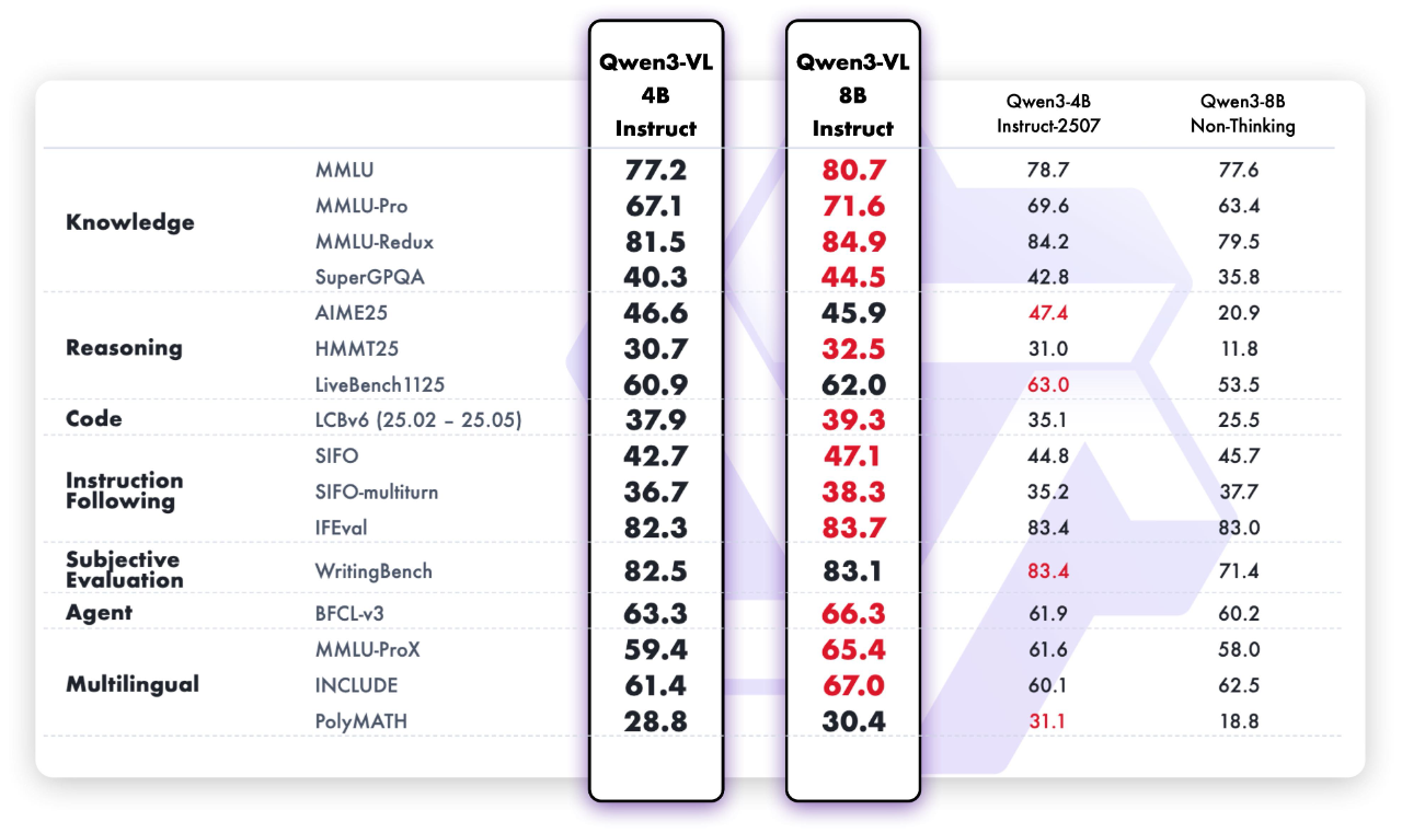 值得一提的是,这两款视觉理解模型实现了「视觉精准」与「文本稳健」的协同突破:针对小模型常见的“跷跷板”问题(提升视觉能力往往牺牲文本性能,反之亦然),阿里通过架构创新和技术优化,让模型在保持文本理解能力的同时,增强多模态感知与视觉理解能力,小身板里塞进了更强的视觉和文本能力。