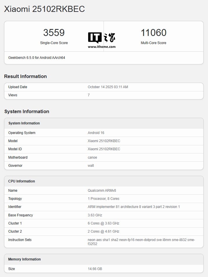 IT之家 10 月 15 日消息,科技媒体 Notebook Check 今天(10 月 15 日)发布博文,报道称小米 REDMI K90 Pro 手机现身 GeekBench 跑分库,6.5.0 版本单核成绩为 3559 分,多核成绩为 11060 分。