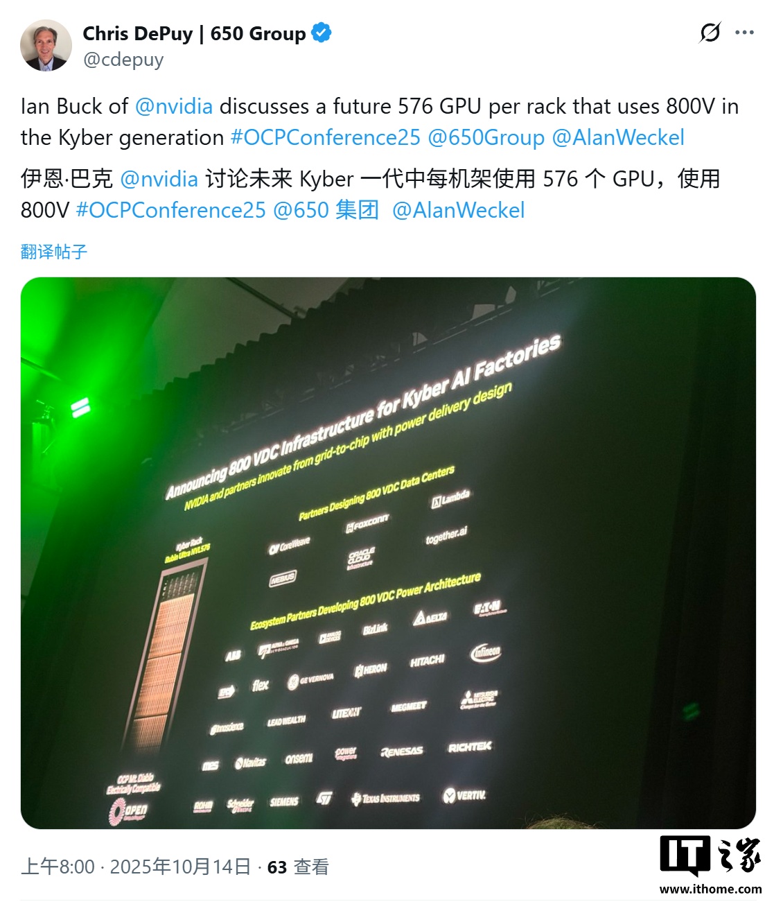 IT之家 10 月 15 日消息,科技媒体 Wccftech 昨日(10 月 14 日)发布博文,报道称在 2025 年 OCP 全球峰会上,英伟达勾勒了“AI 工厂”的未来,展示了 Kyber 机架级技术平台的开发成果,未来将扩展至 NVL576 配置。