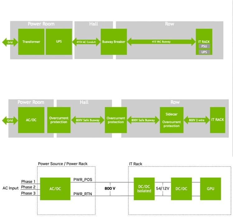 在供电技术方面,Kyber 平台将引领一次重大变革,从当前主流的 415V 或 480V 三相交流供电系统,全面转向 800V 直流(VDC)供电模型。