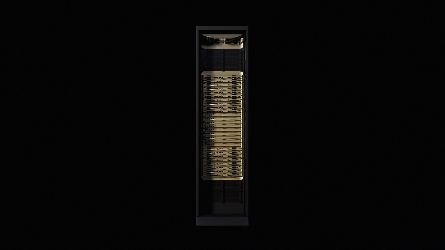 Kyber 平台的核心架构创新在于引入了“垂直刀片”(vertical blades)设计。具体而言,该技术彻底改变了传统的水平服务器布局,将计算托盘像书本一样垂直堆叠和部署。